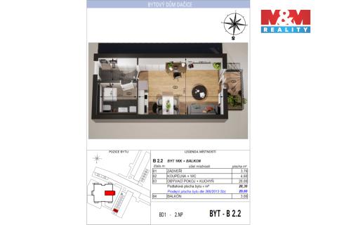 Připravujeme prostorný byt 1+kk (29,6 m²) v moderní energeticky úsporné dřevostavbě na Červeném vrchu. Součástí bytu je balkon (3 m²).Byt bude vybaven v tomto standardu: Koupelna (dlažba, obklad, toaleta, vana nebo sprchový kout, umyvadlo, baterie). Podlahové krytiny - (dlažba, plovoucí podlaha). Součástí jsou dveře a dřevěné obložení v dekoru, vnitřní parapety oken. Vytápění je řešeno společným plynovým kotlem s radiátory v obytných prostorách a topný žebřík v koupelně. Dále Vám byt nabídne vlastní parkovací stání a praktickou komoru, která poskytne dostatek úložného prostoru. K nastěhování bude už od září 2026. Dačice jsou město s jedinečnou atmosférou na pomezí Čech a Moravy, nabízí historické centrum se zámkem, útulné kavárny i přírodu na dosah. K dispozici jsou byty od 1+kk až do 3+1. Pro více informací volejte makléře.
