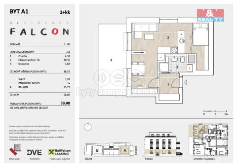 Nově spouštíme prodej bytových jednotek v budově A projektu Residence Falcon, který vzniká v klidné části Mělníka – ul. Sokolská. Lokalita nabízí výbornou dostupnost do Prahy (30 minut od Letňan, spojení PID), kompletní občanskou vybavenost v místě a základní školu doslova za rohem. Klidné prostředí bez dopravní zátěže doplňuje blízkost přírody i možnosti pro sport a volný čas. Byt se nachází v 1. nadzemním podlaží a nabízí dispozici 1+kk o výměře 39m². K jednotce náleží balkon 16m², sklep 2m² a parkovací stání. Klienti mají na výběr ze dvou vysokých standardů vybavení – Friendly a Gorgeous, zahrnujících velkoformátová okna, izolační trojskla a kvalitní materiály. Rezidenční areál nabídne oplocení, kamerový systém, kontrolovaný přístup a chráněné atrium pro klidnou relaxaci. Výstavba začne ve 3. čtvrtletí 2025, dokončení je plánováno na srpen 2027. Architektonický návrh zpracovalo renomované studio DVĚ. Pro více informací neváhejte kontaktovat makléře!