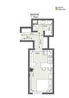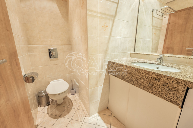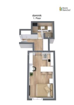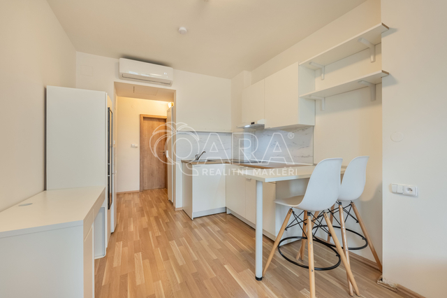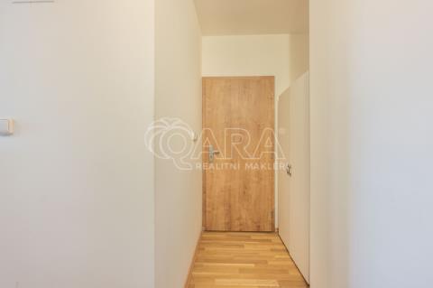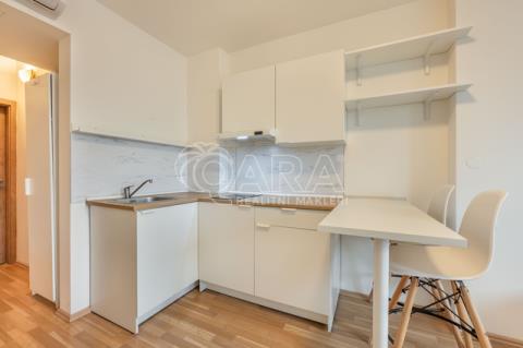 Byt je ve velmi dobrém stavu a má praktické uspořádání – menší rohová kuchyň s barovým pultem je propojená s obývacím pokojem. Dále je zde chodba ze které se dostanete do koupelny se sprchovým koutem a WC. Byt je připravený na bydlení či pronájem, bez nutnosti investic. Velkou výhodou je klimatizace, podlahové vytápění v koupelně a vybavení bytu (viz. fotografie) které je součástí prodeje.