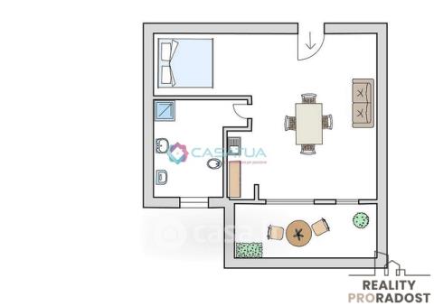 Jednolůžkový pokoj s kuchyňským koutem a ložnicí, samostatná koupelna s oknem a sprchovým koutem.