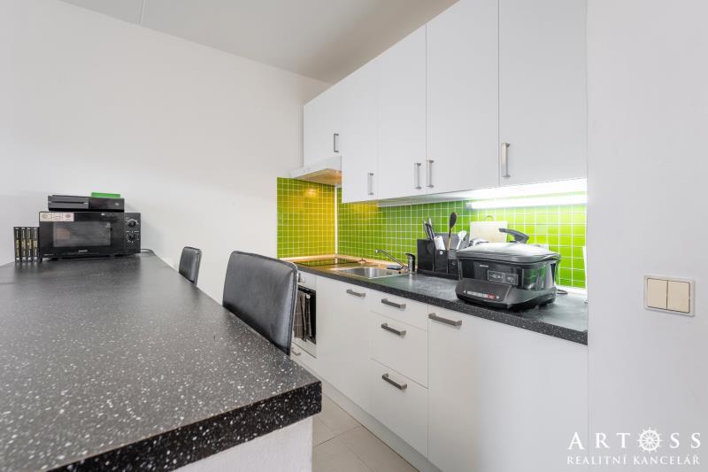 - Hlavní obytný prostor s kuchyňským koutem (cca 20 m²) - kuchyň je prakticky oddělena ostrůvkem, který slouží jako jídelní i pracovní plocha. Přirozeně dělí kuchyň a obytnou část, což nájemníci oceňují.