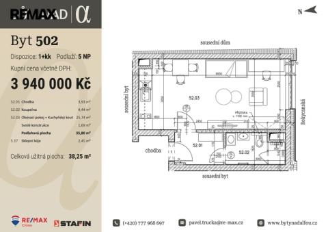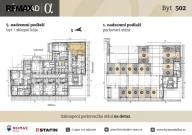 Celková užívaná plocha činí 38,25 m2 a sestává z podlahové plochy bytu 35,80 m2 vč. svislých konstrukcí 1,69 m2 a sklepní kóje na patře o výměře 2,45 m2. Tento byt tvoří obývací pokoj s prostorem pro kuchyňskou linku o výměře 25,74 m2, koupelna se sprchovým koutem a WC o výměře 4,44 m2 a chodba o výměře 3,98 m2. Momentálně si lze v uvedené ceně vybrat doplňky jako podlahové krytiny, dekor dveří, obklady, dlažby a sanitu, a to ze zvolených standardů, popř. si připlatit za jiné dle vašeho výběru.