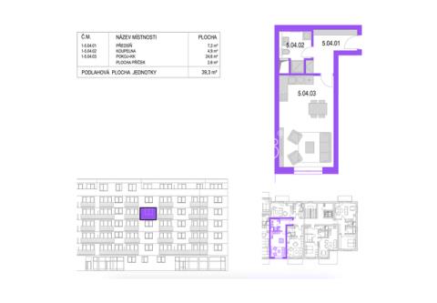 Dispozice: předsíň: 7,2 m², koupelna: 4,9 m², obývací pokoj s kuchyňským koutem: 24,6 m², příčky: 2,6 m², sklep: 3,4 m². Celková plocha: 39,3 m² + sklep 3,4 m².