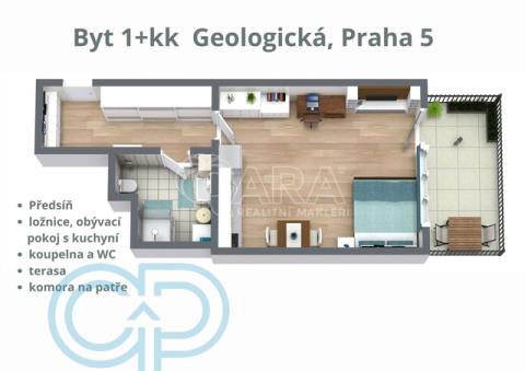 V zastoupení vlastníků nabízím k prodeji velmi příjemný byt o dispozici 1+kk (39,6 m²) s terasou 9m2 orientovanou do dvora. Nachází se v ulici Geologická, uprostřed klidné a vyhledávané části pražského Barrandova. Byt se nachází v rezidenčním projektu z roku 2012.