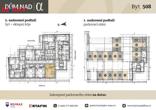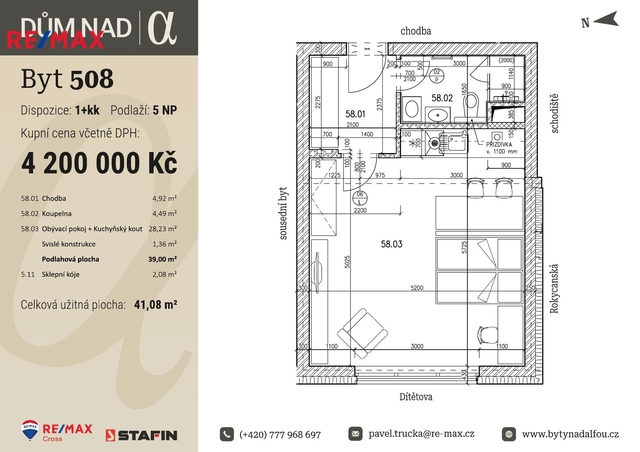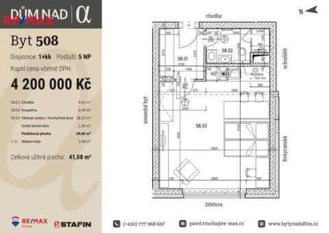 5.08 Nabízíme k prodeji moderní byt 1+kk s bezbariérovým přístupem, který se bude nacházet v V. NP novostavby s výtahem, která vzniká v Plzni na Doubravce na křížení ulic Dítětova a Rokycanská v blízkosti Divadla Alfa. Celková užívaná plocha činí 41,08 m2 a sestává z podlahové plochy bytu 39,00 m2 vč. svislých konstrukcí 1,36 m2 a sklepní kóje na patře o výměře 2,08 m2. Tento byt tvoří obývací pokoj s prostorem pro kuchyňskou linku o výměře 28,23 m2, koupelna se sprchovým koutem a WC o výměře 4,49 m2 a chodba o výměře 4,92 m2. Momentálně si lze v uvedené ceně vybrat doplňky jako podlahové krytiny, dekor dveří, obklady, dlažby a sanitu, a to ze zvolených standardů, popř. si připlatit za jiné dle vašeho výběru. Ve společném garážovém prostoru se bude nacházet několik parkovacích míst, o jejichž aktuální dostupnosti Vám poskytneme více informací na dotaz. Energeticky chytrý dům – moderní kombinace plynového zdroje tepla a FVE umístěné na střeše objektu = výjimečný systémem zajišťující uživatelům levnější provoz rozdělováním výroby elektrické energie použité v bytech, společných prostorách a následně pro ohřev vody na TUV a teplo v kotelně. Jelikož se jedná o moderní dům, energetická náročnost budovy vychází na B, okna jsou plastová s izolačními trojskly, el. v mědi (230 V / 380 V do kuch. koutu), rozvody vody a kanalizace v plastu, dveře a zárubně zn. Sapeli a domofon s funkcí videofonu. Pro případné venkovní stínění na elektrický pohon je provedena elektroinstalace s přerušeným tepelným mostem. Dům bude disponovat optickým rozvodem pro internet. Kupní cena je uvedena vč. DPH. Více informací lze zjistit na webových stránkách projektu nebo u makléře nabídky. Stavba má být dokončena v červenci 2027, zkolaudována a k nastěhování od října 2027. Investorem a generálním dodavatelem celého projektu je společnost STAFIN a.s.