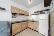 • Obývací pokoj s kuchyňským koutem (22,14 m²): Plně vybavená linka se sklokeramickou deskou, dřezem, lednicí, mrazákem a mikrovlnkou.