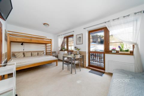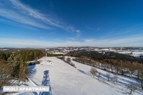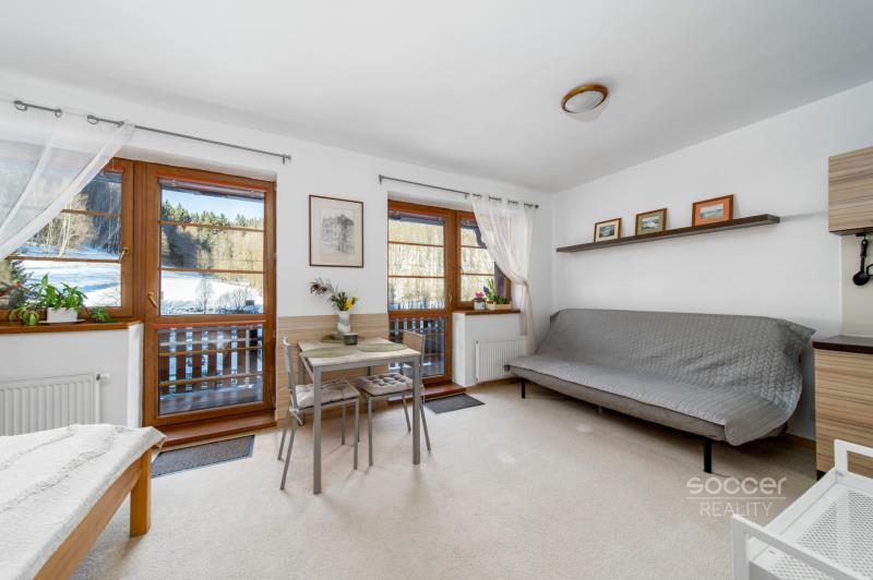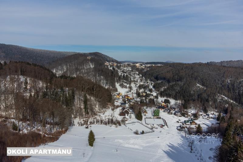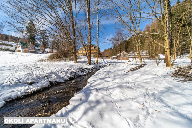 Z obýváku přímo na sjezdovku! Stylový apartmán 1+kk (36,8 m²) s balkonem (7 m²), sklepem a parkováním – Prkenný Důl