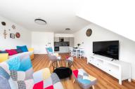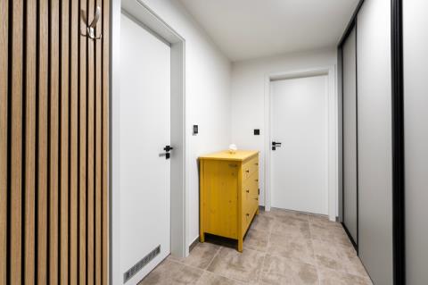 Apartmán je dokončen v nadstandardním provedení, které zahrnuje kvalitní plastohliníková okna s izolačním trojsklem, venkovní žaluzie, podlahové vytápění, v koupelně navíc s topným žebříkem, elektrický zásobníkový ohřívač vody, zabezpečovací zařízení JABLOTRON s aplikací pro dálkové ovládání alarmu i celé domácnosti (ovládání topení, venkovních žaluzií či vjezdové brány), interiérové dveře bílé s obložkovými zárubněmi, lepené vinylové podlahy v kombinaci s keramickou dlažbou, obklady či sanitu od renomovaných výrobců. Internet přes optické kabely zajišťuje společnost CETIN. Součástí vybavení je také na míru vyrobená kuchyňská linka včetně vestavné elektrické trouby, varné desky, digestoře, myčky nádobí a ledničky s mrazákem, a dále vestavěná šatní skříň s množstvím úložného prostoru v předsíni.