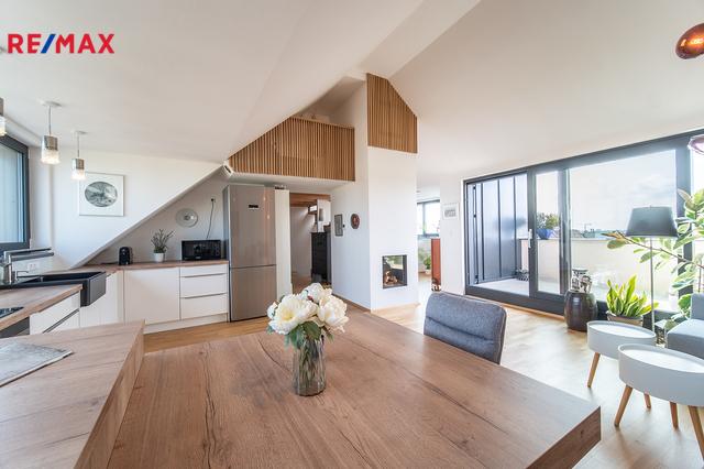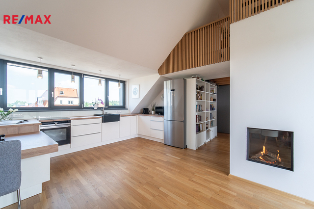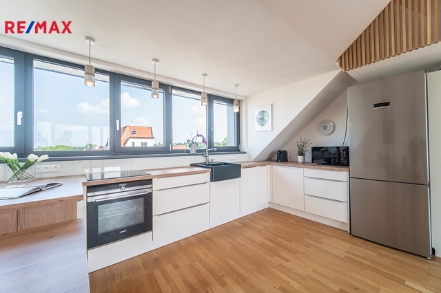Byt je vybaven kvalitními materiály, mezi které patří plovoucí podlaha, dlažba v koupelně, a trojskla oken, která zajišťují vynikající odhlučnění a spolu s předokenními žaluziemi stabilní teplotní podmínky během celého roku. V koupelně je podlahové topení, vytápění bytu zajišťuje plynová kotelna v domě. Součástí bytu je moderní kuchyňská linka s vestavěnými spotřebiči (sklokeramická varná deska, elektrická trouba, myčka, lednice s mrazákem a mikrovlnná trouba). Prostor je dále vybaven klimatizací, která slouží k vytápění i chlazení, a rekuperací. Dominantou je elegantní vestavěný plynový krb – nejen funkční doplněk, ale i stylový prvek, který dodává bytu úžasnou atmosféru.