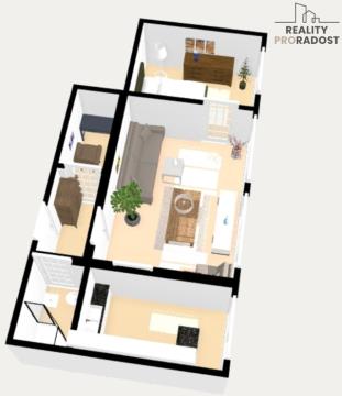 Dispozice bytu jsou - předsíň, obývací pokoj, kuchyně, ložnice, koupelna s toaletou a praktická šatna.