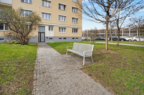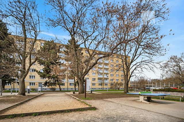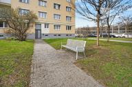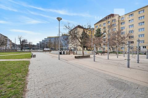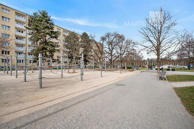 A právě okolí je na tomhle bytě další silná karta. Hned před domem máte náměstí s lavičkami, hřišti a školou. Minutku od vchodu je tramvaj a výborně dostupné je i metro B — ať už Českomoravská, nebo Palmovka. Na Sokolovské máte obchody, služby a vůbec všechno. A když budete chtít trochu vypnout, park Podvinní je odsud opravdu kousek. Je to přesně ten typ lokality, která spojuje městskou praktičnost s možností normálně fungovat i mimo byt.