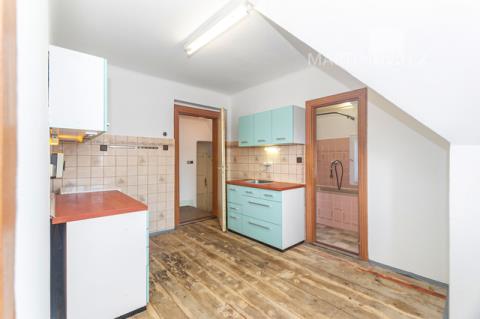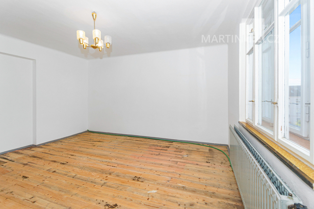 Strašnice. Klidná vilová čtvrť, pár kroků od centra Prahy a přesto úplně jiný svět. Ve Vykáňské ulici stojí dům se třemi bytovými jednotkami a v jeho nejvyšším, tedy druhém patře se právě prodává částečně podkrovní byt o dispozici 2+1 a velikosti 58,4 m².
