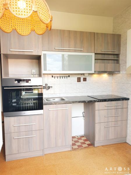 V bytě zůstává nová kuchyňská linka včetně elektrické trouby, sklokeramické varné desky, nové myčky (není na fotografii) a digestoře. Vestavěné skříně v chodbě nabízejí dostatek úložných prostor.