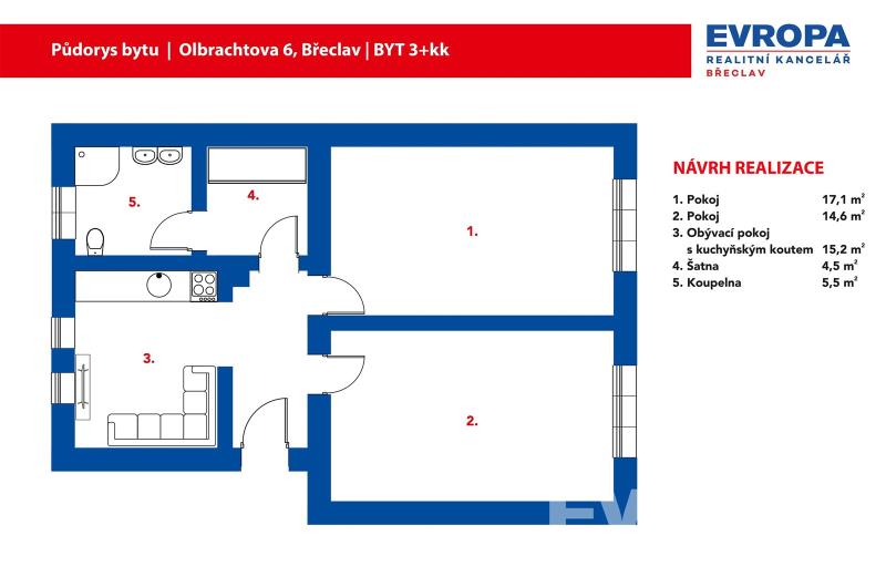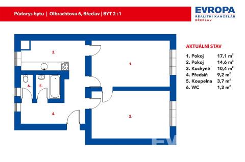 Hledáte klidné bydlení v oblíbené části Břeclavi s kompletní občanskou vybaveností v docházkové vzdálenosti? Na ulici Olbrachtova pro vás máme byt, který si snadno přetvoříte přesně podle sebe. Nachází se ve 2. nadzemním podlaží třípodlažního domu, má 64,5 m² a je kompletně vyklizený – připravený na váš nový začátek. Co vás zaujme: Čisté plátno pro rekonstrukci: byt je v původním stavu a již vyklizen, ideální k úpravám na míru. Chytrá změna dispozice: aktuálně 2+1, jednoduchou úpravou lze vytvořit moderní 3+kk a navýšit užitnou plochu cca o 1 m² (odhadovaná tržní hodnota cca 57 000 Kč). Dva sklepy: po odstranění příčky lze získat jeden velký, praktický úložný prostor. Stabilní dům: SVJ bez dluhů, na účtu přes 200 000 Kč. Součástí prodeje je i spoluvlastnický podíl 1/6 na společných částech domu (26,5 m²). Technické a praktické výhody: Úspornější provoz: plastová okna a silné obvodové zdi (45 cm) udržují příjemné klima a snižují náklady na energie v bytě. Dům průběžně udržovaný: proběhla kompletní oprava střechy včetně krovů, základy jsou odizolované, ve společných prostorech elektřina již v mědi a vyměněná okna, nové vodoměry, plánovaná výměna stoupaček (oprava bude hrazena z fondu). Zázemí pro denní komfort: společná kolárna a sušárna v domě. Lokalita: Klidná ulice v žádané části Břeclavi, pár minut od služeb, obchodů i dopravy. Ideální pro bydlení i jako investice k pronájmu. Shrnutí: 2+1 (potenciál 3+kk), 64,5 m², 2. NP, ulice Olbrachtova, Břeclav 2 sklepy, podíl na společných částech domu Dům bez dluhů, dobrá správa SVJ Byt v původním stavu – připravený pro vaši rekonstrukci Zaujalo vás to? Napište nebo zavolejte a domluvte si prohlídku. Rádi vám ukážeme i možnosti dispoziční úpravy a orientační náklady rekonstrukce. Těšíme se na setkání.