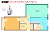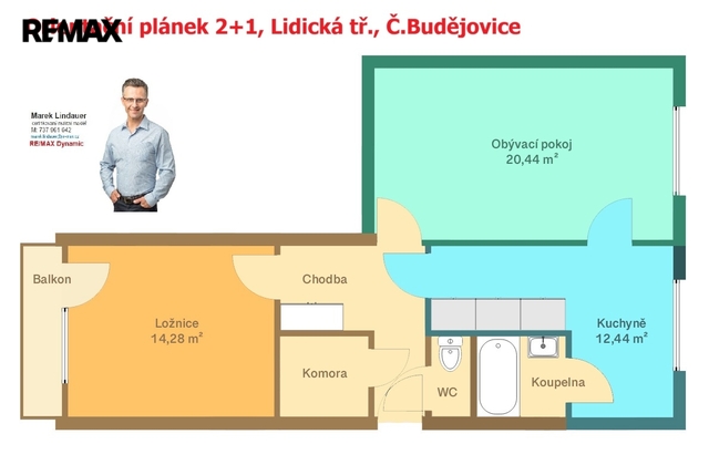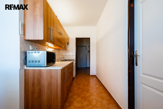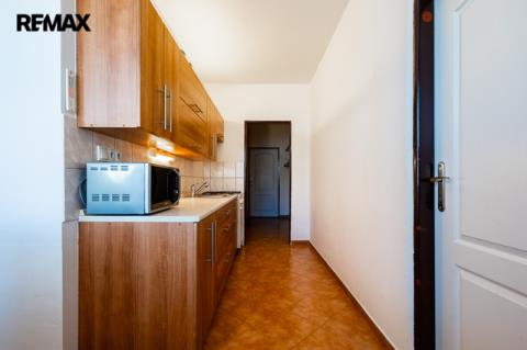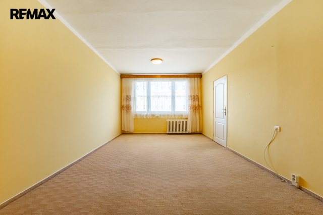 Byt se skládá z obývacího pokoje (20,44 m2), ložnice (14,28 m2) a kuchyně s jídelnou o výměře 12,44 m2. Byt prošel před 10 lety rekonstrukcí, kdy bylo odstraněno původní umakartové jádro a nahrazeno vyzděným, byla instalována nová kuchyňská linka, položena dlažba v kuchyni a chodbě. Dále byly udělány nové rozvody elektřiny v koupelně a kuchyni. Ze vstupní chodby (7,13 m2) je ještě přístup do praktické komory – šatny (3,33 m2).