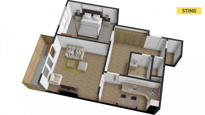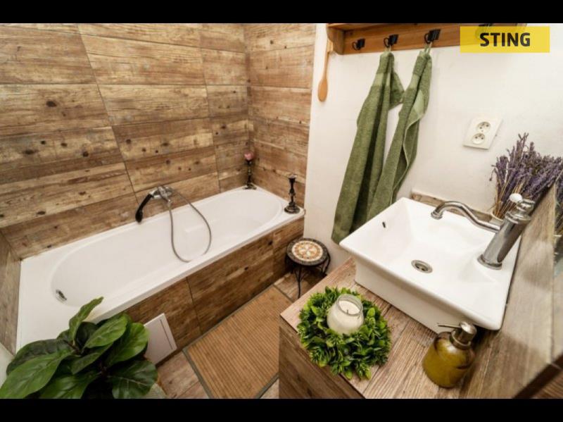 V bytě jsou plovoucí podlahy, koupelna s odděleným WC (2,80 m²) má keramický obklad a dlažbu ladící s celkovým designem. Samozřejmostí je kabelová televize i Wi‑Fi.