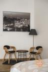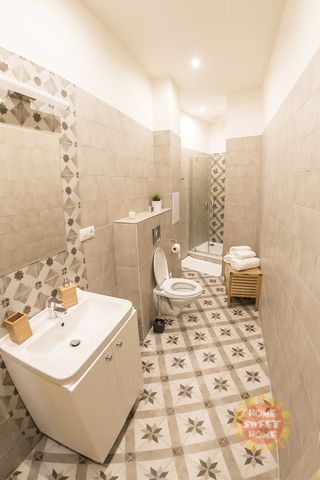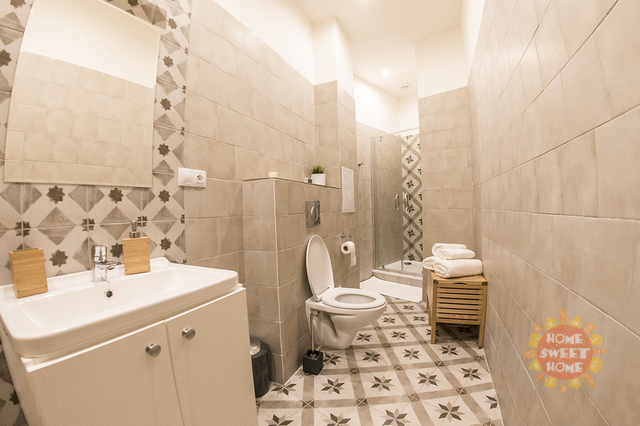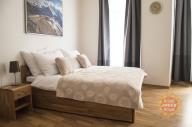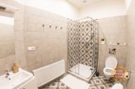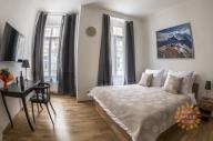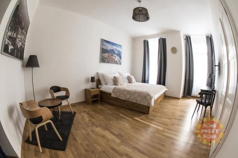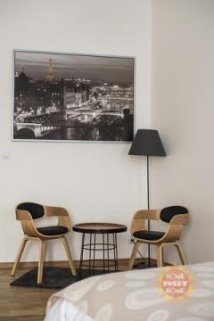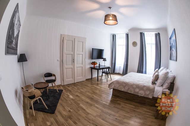 Bytová jednotka je členěna na dva samostatné apartmány o rozloze přibližně 45 m², které jsou spojeny průchozími odhlučněnými křídlovými dveřmi. Každý apartmán disponuje vlastní koupelnou s WC a chodbou se zabudovanými skříněmi, což poskytuje ideální podmínky pro pohodlné bydlení. Historické výklenky s dvěma okny s dvojskly v každém pokoji zajišťují dostatečné množství denního světla.
