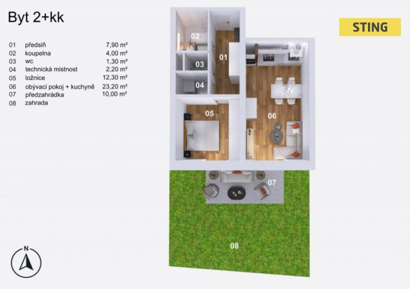 Ve výhradním zastoupení klienta vám představujeme projekt "OASA" na ulici Slezské v Malých Hošticích. Jedná se projekt "Bydlení v zahradě", který bude umístěn v krásné a žádané lokalitě v zastavěné proluce rodinných domu. Dům bude mít rezidenční charakter, prostornou zahradu se vzrostlým sadem a celý prostor bude uzavřen branou na dálkové ovládání. Každý byt je unikátní, byty v přízemí disponují terasou s krásnou předzahrádkou na jižní stranu, stejně tak byty v II. a III.N.P mají vždy luxusní, prostornou zastřešenou terasu, přístupnou z obývacího pokoje s orientací na jih. U vybraných bytů ve III.N.P. budou přiznané dřevěné stropy s loftovým charakterem. Projekt bude nabízet byty 1+KK, 2+KK a 3+KK které budou dodávány na klíč – hotové koupelny a kuchyně včetně spotřebičů, v ceně bytu budou vlastní kóje umístěné v bezprostřední blízkosti bytu. V domě bude myšleno i na bezbariérovost, k dispozici bude výtah. V areálu bude k dispozici zastřešené parkovací stání, které bude možno dokoupit. Zahájení výstavby: 12/2025. Dokončení: 05/2027. Rezervace jsou již otevřeny – kontaktujte nás pro více informací. Byt 1.2. Do konce ledna 2026 nabízíme prostřednictvím našeho partnera úrokové sazby od 4,29 % p.a. Více informací Vám sdělí náš specialista na prohlídce.