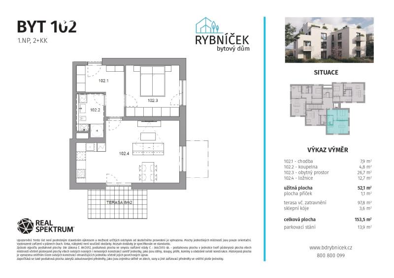Ve výhradním zastoupení investora vám nabízíme moderní byt 2+kk s velkorysou terasou se zatravněním a vlastím parkovacím stáním, který je součástí zcela nového čtyřpodlažního bytového domu v projektu Bytový dům Rybníček. K bytu dále náleží sklepní kóje, která poskytuje dostatek úložného prostoru.