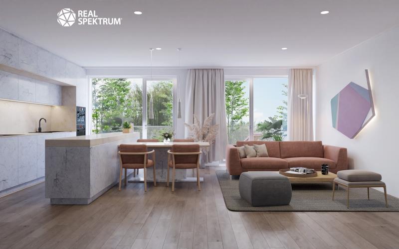 Tento byt vyniká nadstandardním vybavením a moderním minimalistickým designem, který kombinuje vzdušný interiér s důrazem na praktičnost. Celý projekt je pečlivě zasazen do okolí a nabízí klidné prostředí v harmonii se zelení, přitom však zůstává ideálně propojen s městským životem.
