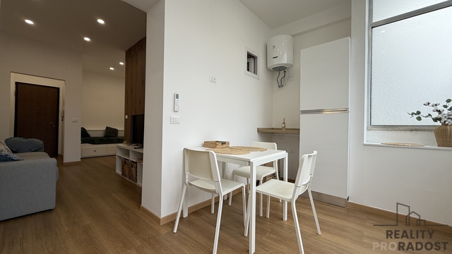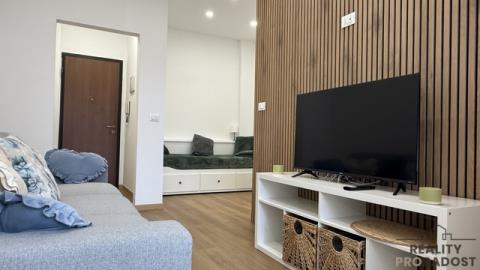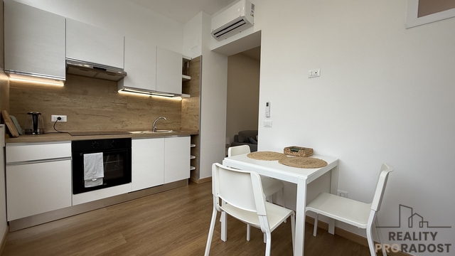 Dispozice bytu je promyšlená do posledního detailu. Zahrnuje útulnou ložnici, moderní koupelnu, světlý obývací pokoj a kuchyň propojenou s lodžií, která je celá zasklená otevíracími okny – vytváří tak jedinečný pocit, že stolujete přímo pod mořským nebem. Prostor působí otevřeně, vzdušně a mimořádně útulně.