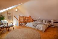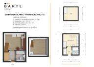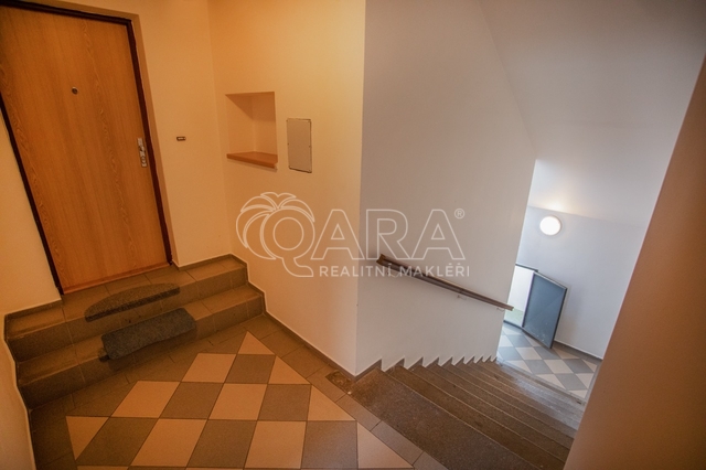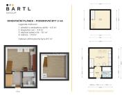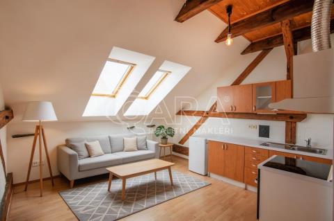 Dispozice bytu je řešena jako mezonet, což jej výrazně odlišuje od běžné nabídky menších bytů. Spodní část tvoří vstupní předsíň s prostornou vestavěnou skříní, obytný prostor s kuchyňským koutem a koupelna s vanou a WC. Do horního patra, kde se nachází samostatná ložnice, vedou dřevěné schody. Podkrovní provedení s přiznanými dřevěnými trámy dodává interiéru osobitý charakter a příjemnou atmosféru. Díky umístění v podkroví působí byt velmi světlým a vzdušným dojmem.