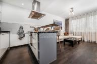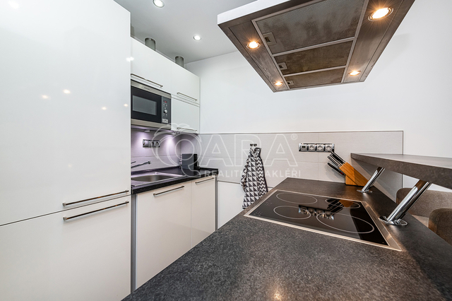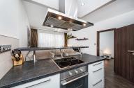 Elegantní kuchyňská linka je vybavena vestavnými spotřebiči - lednicí s mrazákem, troubou a varnou deskou, myčkou a barovým pultem. To vše doplněno kvalitní digestoří, dostatečně velkou pracovní plochou a dobře řešenými úložnými prostorami včetně el. podlahového vytápění.