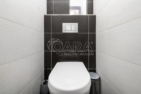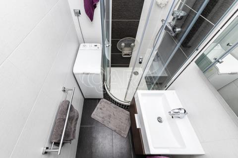Koupelna prošla při kompletní rekonstrukci dechberoucí proměnou, která znamenala změnu dispozice i nadčasový design. Kombinace bílých velkoformátových obkladů, , elegantní baterie, obdelníkové bílé umyvadlo a zrcadlo. Zvětšený sprchový kout je opatřen skleněnými dveřmi a celodenní únavu můžete ze sebe smýt pod sprchou se systémem padajícího deště na přídavném sedátku. Toaleta je se systémem Geberit.