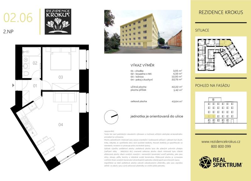 Nabízíme byt 2+kk v novém rezidenčním projektu Rezidence Krokus, situovaném v klidné a zavedené lokalitě městské části Brno-Židenice. Bytový dům je navržen s důrazem na praktické dispoziční řešení, dostatek denního světla a energetickou úspornost – spadá do energetické třídy A. Byt je vhodný jak pro vlastní bydlení, tak jako investiční příležitost k pronájmu. V okolí se nachází kompletní občanská vybavenost včetně obchodů, služeb, škol i zastávek MHD. Lokalita zajišťuje rychlé spojení do centra Brna i napojení na dálnice D1 a D2. V případě zájmu o bližší informace nebo prohlídku nás neváhejte kontaktovat. Dispozice bytu: vstupní chodba (3,05 m²), obývací pokoj s kuchyňským koutem (22,78 m²),ložnice (12,00 m²), koupelna s WC (4,39 m²)