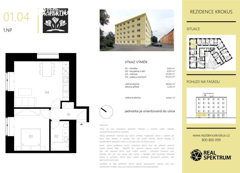 Nabízíme byt 2+kk v novém rezidenčním projektu Rezidence Krokus, situovaném v klidné a zavedené lokalitě městské části Brno-Židenice. Bytový dům je navržen s důrazem na praktické dispoziční řešení, dostatek denního světla a energetickou úspornost – spadá do energetické třídy A. Byt je vhodný jak pro vlastní bydlení, tak jako investiční příležitost k pronájmu. V okolí se nachází kompletní občanská vybavenost včetně obchodů, služeb, škol i zastávek MHD. Lokalita zajišťuje rychlé spojení do centra Brna i napojení na dálnice D1 a D2. V případě zájmu o bližší informace nebo prohlídku nás neváhejte kontaktovat. Dispozice bytu: vstupní chodba (3,93 m²), obývací pokoj s kuchyňským koutem (21,23 m²), ložnice (12,94 m²), koupelna s WC (4,52 m²)