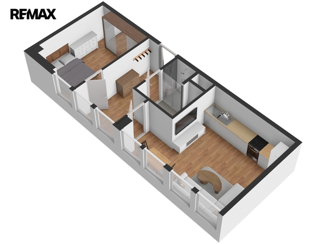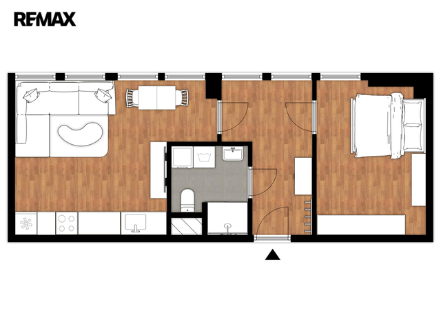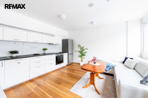Byt se skládá ze vstupní chodby, obývacího pokoje s kuchyňským koutem, samostatné ložnice a koupelny s WC. Kuchyňská linka je vybavena vestavěnými spotřebiči – elektrickou varnou deskou, elektrickou troubou, myčkou nádobí a digestoří. Koupelna disponuje sprchovým koutem, umyvadlem a plnohodnotným místem pro pračku i sušičku. Vytápění a ohřev vody jsou řešeny dálkově.