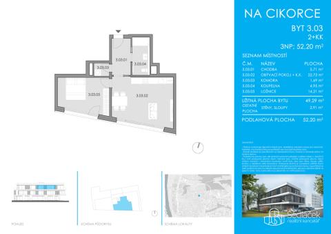 V exkluzivní lokalitě Prahy 12 – Modřany vám nabízíme jedinečnou příležitost ke koupi moderní bytové jednotky 2+kk v připravovaném projektu Rezidence Cikorka, který klade důraz na komfortní bydlení, elegantní architekturu a maximální soukromí. Kupující neplatí žádnou provizi – výhodná nabídka bytu přímo od developera. Byt o dispozici 2+kk s užitnou plochou 52,20 m², situovaný ve 3. nadzemním podlaží. Promyšlená dispozice nabízí vzdušný obývací prostor s kuchyňským koutem a samostatnou ložnici, která zajišťuje dostatek soukromí. Dispozice bytu: • vzdušný obývací prostor s kuchyňským koutem • samostatná ložnice • koupelna s toaletou • chodba • komora Technické standardy a vybavení: • bezpečnostní vstupní dveře • vnitřní podlahy – dřevěné nebo dlažba (dle výběru klienta) • terasa a předzahrádka – dřevěná nebo velkoformátová dlažba • kompletní sanitární vybavení a obklady • vnitřní dveře • hliníková okna s izolačním trojsklem • venkovní žaluzie pro stínění a tepelný komfort • podlahové vytápění ve všech místnostech • tepelné čerpadlo pro vytápění a ohřev TUV • rekuperace vzduchu • příprava na klimatizaci • bezbariérový přístup do celého domu • venkovní parkovací stání Rezidence Cikorka se nachází v klidné rezidenční zástavbě s dostatkem zeleně a výbornou dopravní dostupností do centra města. Projekt nabízí pouze 12 bytových jednotek, což zaručuje komorní charakter a klidné bydlení. Kolaudace – konec roku 2026. Cena parkovacího stání není zahrnuta v ceně bytu. Vizualizace a fotografie mají pouze ilustrační charakter. Vyhrazujeme si právo na změny v průběhu realizace projektu. Nemovitost lze financovat hypotečním úvěrem – s jeho vyřízením vám rádi pomůžeme. Zveme vás na osobní schůzku do naší kanceláře v Praze či Sokolově, kde vám rádi představíme projektovou dokumentaci a probereme možnosti individuálních úprav dle vašich představ. Jsme vám k dispozici – neváhejte se na nás obrátit. Tento byt je skvělou volbou jak pro vlastní bydlení, tak jako investiční příležitost.