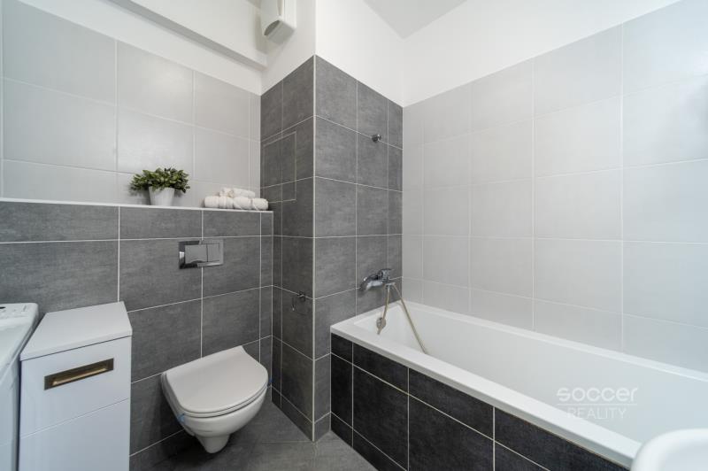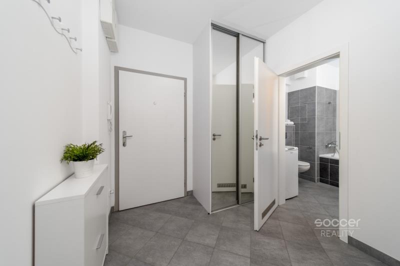Soccer Reality výhradně zprostředkuje koupi bytu 2+kk o celkové ploše 56 m² včetně balkonu, umístěného ve 2. patře moderního bytového domu v klidné ulici Farkašova, Praha 9 – Kyje. Byt má východní orientaci, je dobře prosvětlený a vybaven klimatizací, která zvyšuje komfort bydlení zejména v letních měsících. Dispozice je řešena velmi prakticky. Ze vstupní chodby je samostatný přístup do všech místností. Byt nabízí oddělenou ložnici, obývací pokoj a koupelnu s toaletou. Kuchyňský kout je umístěn ve vlastním výklenku, není tedy přímo součástí obývacího prostoru, což je výrazná výhoda z hlediska komfortu bydlení. Kuchyňská linka je vybavena vestavnými spotřebiči – elektrickou troubou, mikrovlnnou troubou, indukční varnou deskou, vestavnou lednicí s mrazákem, myčkou nádobí a digestoří s odtahem. Z obývacího pokoje je vstup na prostorný balkon o velikosti 7,75 m², který nabízí dostatek místa pro posezení. Ložnice disponuje vestavnou skříní na míru. Koupelna je společná s WC a je vybavena vanou. V obytných místnostech jsou plovoucí podlahy, v koupelně a předsíni dlažba. K bytu náleží garážové parkovací stání v podzemních garážích domu, které je ve výlučném užívání. Další parkování je možné v okolí domu. Bytový komplex v Kyjích je výbornou kombinací klidu a ruchu velkoměsta. Lokalita jako taková je tichá a příjemná, do centra města se ale autem dopravíte během chvíle. K dispozici je i autobusová zastávka Sicherova, odkud se svezete na Černý Most nebo do Holešovic. V okolí najdete několik restaurací, fitness, mini-market. Nákupní centra Černý Most a Letňany jsou v dojezdové vzdálenosti přibližně 5-10 minut. Byt je vhodný pro jednotlivce nebo pár, kteří hledají funkční dispozici, balkon a garážové stání v klidné lokalitě s rychlou dostupností města. Prodávající si vyhrazuje právo vybrat kupujícího dle jím zvolených kritérií.