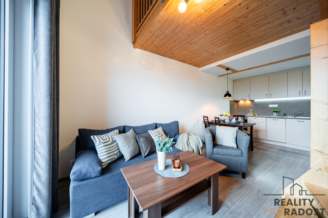 Byt se pyšní vnitřním schodištěm, což umocňuje jeho jedinečnost a poskytuje pohodlné propojení mezi patry. Na patře najdete útulnou ložnici, která nabízí klid a soukromí, a galerii, kde jsou umístěny další lůžka. V přízemí se nachází prostorný obývací pokoj, vybavený kuchyňským koutem se všemi potřebnými spotřebiči, a moderní koupelna, která je vybavena sprchovým koutem, toaletou a místem na pračku. Celkem je zde dostatek úložného prostoru, a to díky vestavěným skříním, které přispívají k komfortnímu bydlení.