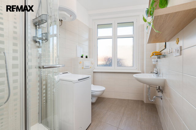 - Z obývacího pokoje je vstup do koupelny se sprchovým koutem a toaletou