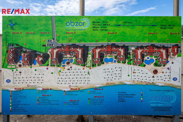 Nachází se přímo na pláži v jednom z nejklidnějších bulharských přímořských míst – městě Obzor. Pláž na bulharském pobřeží Černého moře – 10 km. Téměř každý apartmán má nádherný výhled na moře. Apartmány jsou prostorné, pohodlné a elegantně zařízené a vybavené vším potřebným pro pohodlí majitelů a hostů.