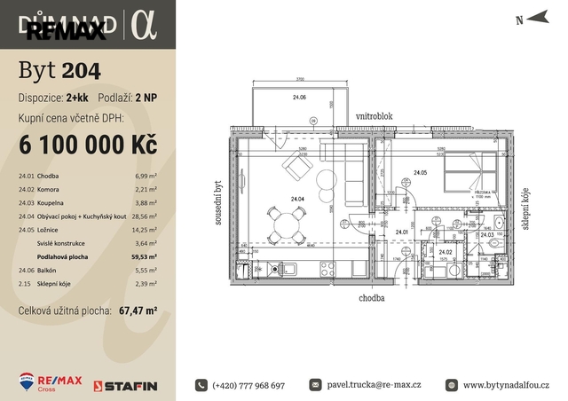 Celková užívaná plocha činí 67,47 m2 a sestává z podlahové plochy bytu 59,53 m2 vč. svislých konstrukcí 3,64 m2, balkonu 5,55 m2 a sklepní kóje na patře o výměře 2,39 m2. Tento byt tvoří obývací pokoj s prostorem pro kuchyňskou linku o výměře 28,56 m2, ložnice o výměře 14,25 m2, koupelna se sprchovým koutem a WC o výměře 3,88 m2, komora o výměře 2,21 m2 a chodba o výměře 6,99 m2. Momentálně si lze v uvedené ceně vybrat doplňky jako podlahové krytiny, dekor dveří, obklady, dlažby a sanitu, a to ze zvolených standardů, popř. si připlatit za jiné dle vašeho výběru.