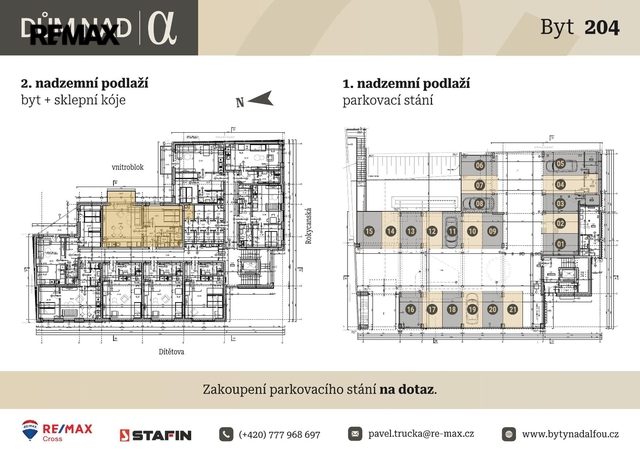 Ve společném garážovém prostoru se bude nacházet několik parkovacích míst, o jejichž aktuální dostupnosti Vám poskytneme více informací na dotaz.