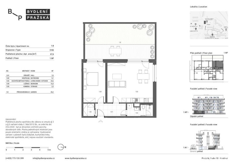 Byt se nachází ve 1.NP s výtahem. Byt o dispozici 2+kk s plochou 67,6 m2 a předzahrádkou o velikosti 45,2 m2. Byt je umístěn na S,Z.