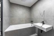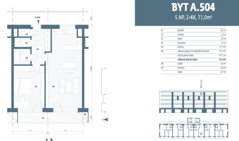 V exkluzivním zastoupení nabízíme k prodeji prostorný byt 2+kk o celkové ploše 71 m², který se nachází v 5. (posledním) patře novostavby s výtahem v klidné části Velvar, ulice Dřevařská. Velkou výhodou bytu je jeho umístění v nejvyšším patře nad vámi už nikdo nebydlí, což zajišťuje maximální klid, soukromí a příjemnou atmosféru bydlení. Z bytu jsou navíc krásné výhledy až na věže náměstí. Dispozice bytu nabízí obývací pokoj s kuchyňským koutem o velikosti přes 35 m² se vstupem na lodžii (9,4 m²), samostatnou ložnici (17,5 m²), koupelnu, oddělené WC a praktickou komoru v bytě. K bytu náleží sklep (2,7 m²). Byt je proveden v nadstandardním designu s důrazem na detail: bezfalcové interiérové dveře Hörmann Durdecor designové kliky, ploché hranaté rozety a tiché magnetické zámky černé panty z edice black.edition a kontrastní antracitová hrana dveří velkoformátové dlažby a obklady Sintesi J.U.S.T. 60×60 cm (mat), obklady až ke stropu černá otopná tělesa v koupelně bílé podlahové lišty prodlužující zdi až k podlaze - mramorové parapety na lodžiích Samozřejmostí jsou hliníková okna s izolačními trojskly a kvalitní zateplení domu. Budova splňuje energetickou náročnost třídy A, což zajišťuje nízké provozní náklady a komfortní vnitřní klima po celý rok. Součástí prodeje je garážové stání v 1. podzemním podlaží domu. Dále je k dispozici sklepní kóje, kolárna a kočárkárna přímo u výtahu. Dům je vybaven plynovým vytápěním a fotovoltaickými panely, které přispívají ke snížení nákladů na provoz společných prostor. Velvary nabízí kompletní občanskou vybavenost a výbornou dopravní dostupnost cca 35 km od Prahy, 5 minut na dálnici D8. Cena bytu s garážovým stáním: 6.490.000 Kč byt + garážové stání 150.000 Kč Byt je ihned k dispozici a pro prohlídku kontaktujte našeho makléře. PS: Ulice Dřevařská ještě není aktuálně na mapách zanesena a inzerát je doplněn o AI vizualizace vybavení.