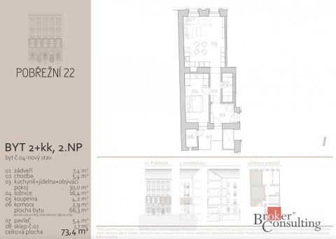 Vstupte do světa kvalitního městského bydlení v prestižní rezidenci Pobřežní 22, kde se historický šarm propojuje s moderním komfortem. Prostorné byty nabídnou více prostoru pro život, práci i relax – ideální volba pro rodiny, páry či každého, kdo nechce dělat kompromisy. V rezidenci Pobřežní 22 právě vzniká unikátní kolekce bytů s dispozicemi 2+kk a 3+kk, které spojují kouzlo historického domu s nadčasovým designem. Tento byt je o dispozici 2+kk s celkovou plochou 73,4 m2, z toho pavlač má 5,4 m2 a sklep 1,7 m2. Je umístěn ve druhém nadzemním podlaží historického cihlového domu. Každý byt projde pečlivou rekonstrukcí, díky níž získáte moderní, komfortní bydlení s důrazem na detail – od prémiových podlah, přes designové dveře až po kvalitní koupelny. Ve všech bytech naleznete Dokončení rekonstrukce je plánováno na konec roku 2026. Nabídka je pouze ilustrativní, jde o vizualizace budoucího stavu. Lokalita, ve které se bytový dům na Pobřežní nachází, má obrovský potenciál pro spokojený městský život – ať už jste jednotlivec, rodina, nebo investor hledající byt na ideální adrese. Karlín a Pobřežní 22 jsou ideálním místem, kde se spojuje pohodlí, dostupnost a životní styl – místo, které má smysl.