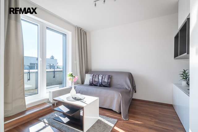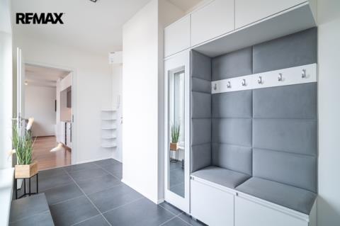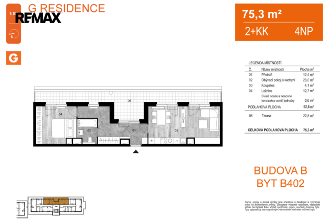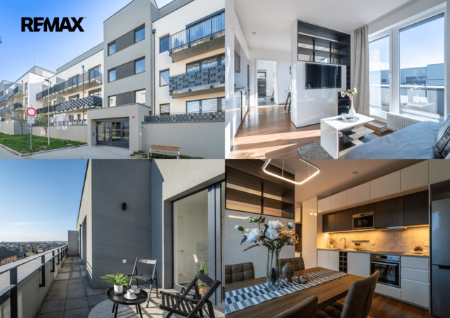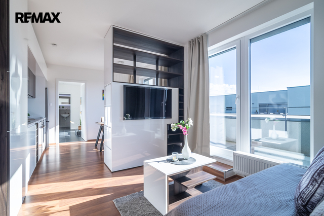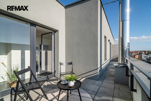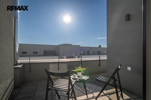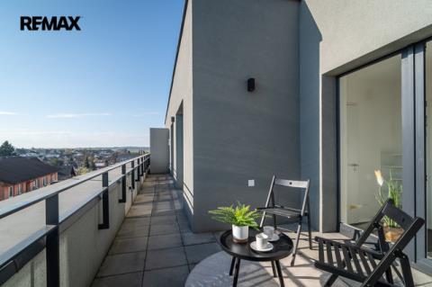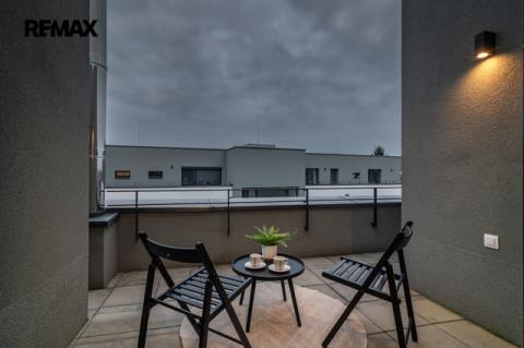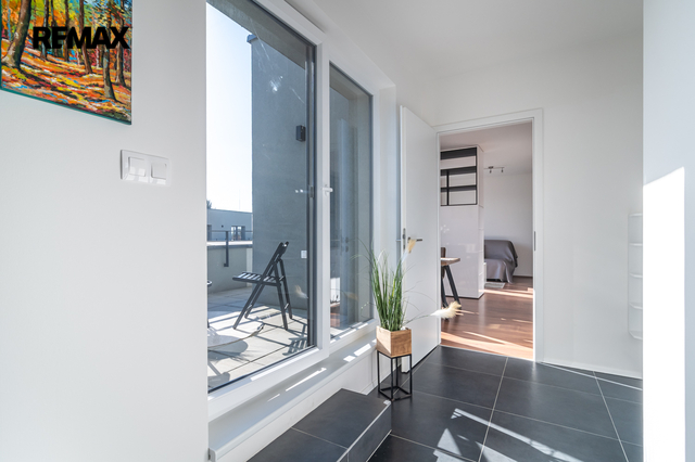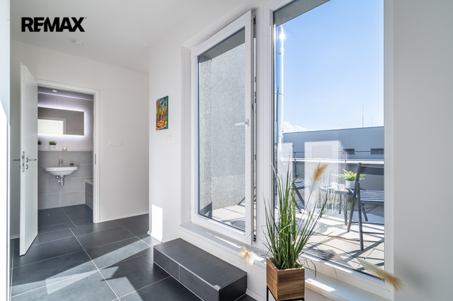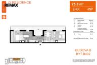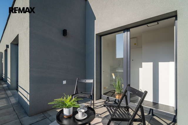 Dispozice bytu 2+kk o celkové užitné ploše 75,3 m² (včetně terasy) je velmi chytře navržena s jasným oddělením denní a noční zóny, které propojuje prostorná předsíň s dostatkem úložných prostor. Dominantou bytu je světlý obývací pokoj s kuchyňským koutem (23,0 m²), který od kuchyně vizuálně odděluje designová dělící stěna s integrovanou praktickou spižírnou. Ložnice (12,7 m²) je vybavena velkorysou vestavěnou skříní s chytrými vnitřními systémy. Absolutním unikátem je terasa o rozloze 22,5 m² a délce přes 17 metrů, na kterou je umožněn vstup velkoformátovými okny ze všech obytných místností včetně vstupní haly. Terasa díky své orientaci a slunečnímu svitu nabízí ideální podmínky pro relaxaci, posezení i pěstování zeleně, přičemž poskytuje otevřený výhled na panorama Unhoště.