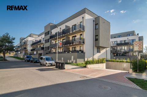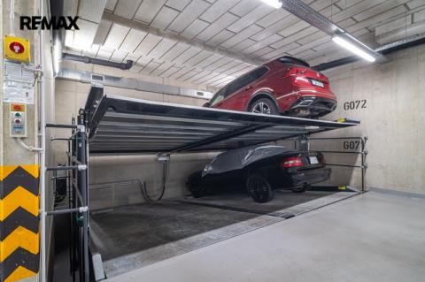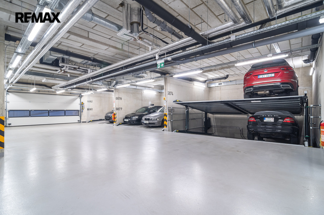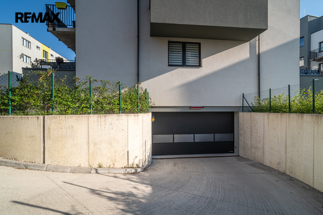 K bytu náleží parkovací stání v moderním garážovém zakladači v suterénu domu a vlastní sklepní kóje.