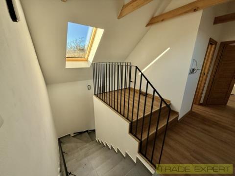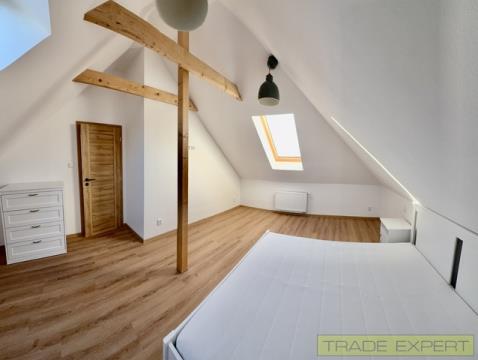 Prodej podkrovního bytu 2+kk, 81 m2, Otmíče, okr Beroun. Bytová jednotka se nachází ve 3. NP kompletně zrekonstruovaného bytového domu: Dispozice: Vstup do bytu z 2. NP. schodiště do 3. NP. zde se nachází hala s pracovním koutem, dále koupelna se sprchovým koutem a WC. Z haly vpravo vstup do podkrovního obývacího pokoje s kuchyňským koutem o výměře 28 m2, vlevo vstup do prostorné ložnice 23 m2. Podlahy v obytných místnostech vinylové, zbytek keramická dlažba. Vytápění bytu a ohřev vody zajištuje tepelné čerpadlo Regulus. Byt je bez kuchyňské linky s možností dodání. Dům je napojen na vodovod, má vlastní čističku odpadních vod. Dešťová voda se po filtraci využívá ke splachování WC. Dům je kompletně zateplen s plastovými okny s trojsklem. Vedle domu je zpevněná plocha s bránou na DO a travní plocha. K bytu je na tomto dvoře vyhrazené parkovací stání. Dům je střežen kamerovým systémem. V obci se nachází Obecní úřad a restaurace. Další služby ve Zdicích, nebo Hořovicích. Nájezd na dálnici D5, 28 km je vzdálen 4 km od domu.