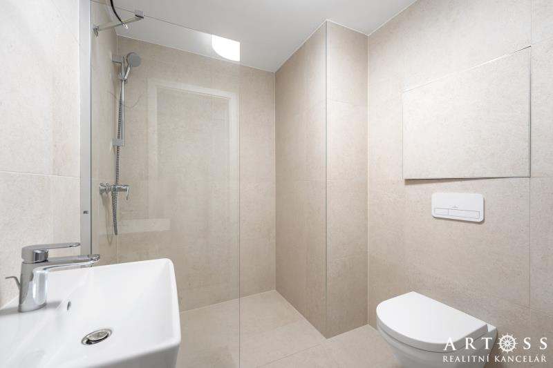 • Koupelna s toaletou 3,8 m² – moderně řešená, vybavená sprchovým koutem,