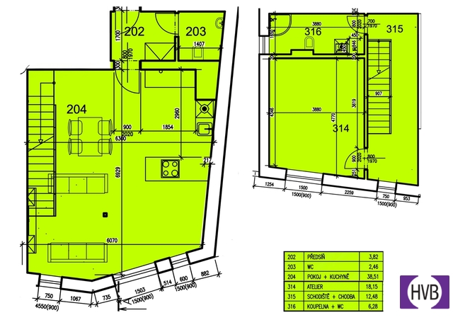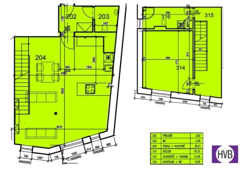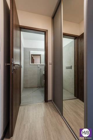 Dispozice bytu nabízí v nižším podlaží chodbu, první z koupelen a prostorný obývací pokoj s plně vybaveným, moderním kuchyňským koutem. Z obývacího pokoje vedou designové schody do druhého patra bytu, kde se nachází chodba s prostorem pro vytvoření pracovního nebo cvičebního koutu, ložnice s velkou vestavěnou skříní se zrcadlem a druhá koupelna se sprchovým koutem, WC, pračkou, sušičkou a plynovým kondenzačním kotlem.