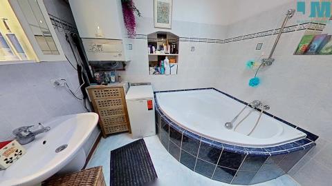 Kuchyně potěší svou velikostí i vybavením – najdete zde kuchyňskou linku, kombi sporák, digestoř a myčku. Koupelna je vybavena vanou, umyvadlem, zrcadlovou galerií, toaletou a plynovým kotlem, který zajišťuje vytápění i ohřev vody. Před bytem se nachází také praktický úložný prostor navíc.