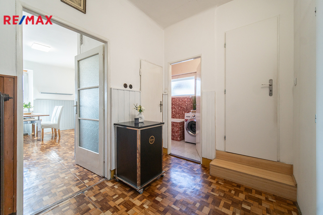 Ke koupi nabízím velký byt 3+1 o výměře 104 m², ke kterému patří zděná garáž a podíl na pozemcích o celkové výměře 1 083 m². Byt zabírá celé 2. nadzemní podlaží rodinného domu a má vlastní oddělený vstup ze zahrady. Dispozičně se skládá ze tří neprůchozích pokojů (14,4 m²; 21,5 m² a 28,6 m²), kuchyně se spíží a komorou (celkem 19,2 m²), chodby, další komory, koupelny a samostatné toalety. Ve výlučném užívání je terasa 8,6 m² přístupná z obývacího pokoje. Dále je možno využívat společné podkroví a společný zděný zahradní domek. V domě jsou pouze 2 byty, tedy jedná se o klidné bydlení pouze s jedním sousedem. Byty jsou samostatně vymezeny a jsou v osobním vlastnictví, vztahy majitelů jsou právně ošetřeny. K bytu patří garáž, která je zapsána v katastru nemovitostí jako samostatná stavba a stanete se jejím jediným majitelem. Pozemek pod domem a zahrada jsou ve spoluvlastnictví. Byt je ve funkčním obývaném stavu, nicméně předpokládá se jeho rekonstrukce. Střecha domu byla rekonstruována přibližně před 25 lety, dům není zateplený. Nabídku oceníte zejména pokud Vás láká komfort bydlení v rodinném domě se zahradou, v těsném sousedství přírody a současně potřebujete pohodlnou dopravní dostupnost do centra Prahy. Ačkoli se dům nachází nad železniční tratí, uvnitř v bytě a v zadní části zahrady nebudete o dopravním ruchu vůbec vědět. Z terasy a z oken bytu je nádherný otevřený výhled na panorama Modřan. A co je nejlepší, jen 2 minuty chůze Vás dělí od Chuchelského háje, přírodní rezervace, která dále navazuje na rezervaci Homolka a přírodní památku Barrandovské skály. Koupi bytu lze financovat hypotečním úvěrem. S jeho hladkým vyřízením a vyjednáním výhodných podmínek Vám rádi pomůžeme. Těším se na viděnou na prohlídce!