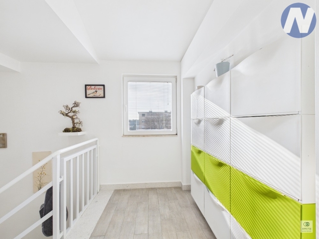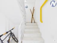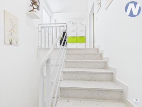 Velkou přidanou hodnotou je soukromí – dům má pouze dva byty. V prvním podlaží se nachází menší byt a dále tento prostorný byt, který se rozprostírá přes tři samostatná podlaží (2. podlaží, 3. podlaží a podkroví). Má vlastní vstup a přístupové schodiště, které využívá výhradně majitel. Hned u vstupu je prakticky řešený prostor se skříňkou na obuv.