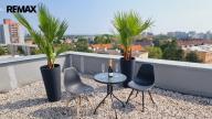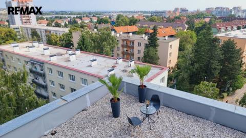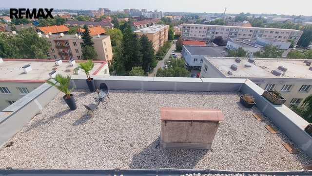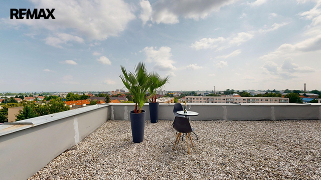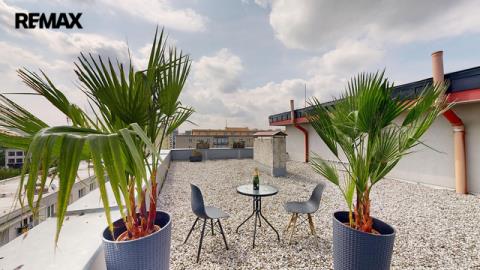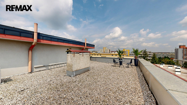 Díky své poloze v nejvyšším podlaží je byt velmi světlý, přičemž místnosti jsou orientovány na jih a sever. Byt má dvě terasy, s jižní orientací 8,4 m² a severní orientací, která má rozlohu bezmála 5,4 m², které umožňují flexibilní využití během dne. Vedle samotného bytu se navíc nachází střešní terasa o velikosti téměř 60 m², na kterou má výhradní přístup pouze majitel bytu. Venkovní prostor je ideální pro odpočinek, relaxaci nebo individuální využití podle potřeb nového majitele.
